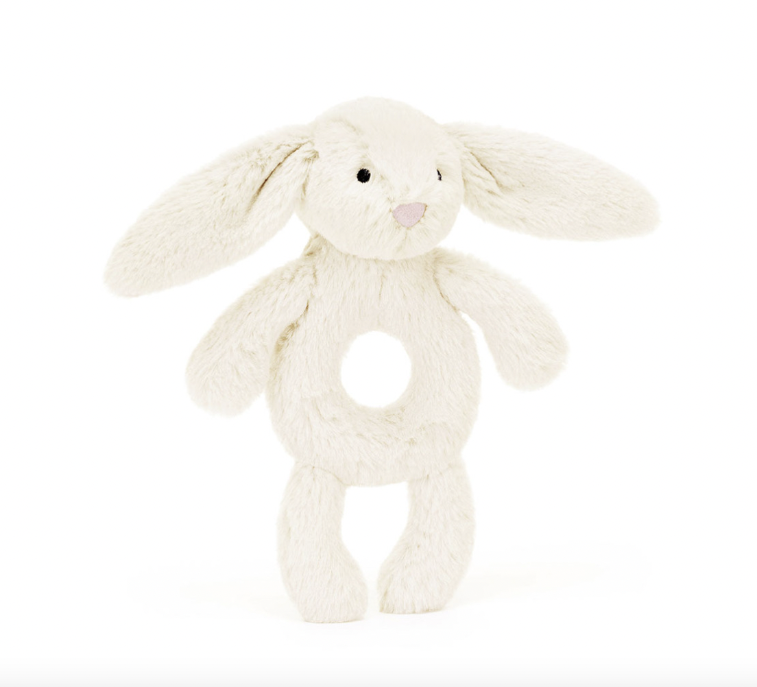 A treat for tiny hands, Bashful Cream Bunny Ring Rattle can be grabbed by its soft paws, long lop ears or ring-shaped tummy. When given a gentle shake it will sound the rattle inside, much to baby’s delight! Crafted in a silver-grey coloured fur made from recycled fibres featuring a Bashful Bunny pink suedette nose and embroidery eyes.