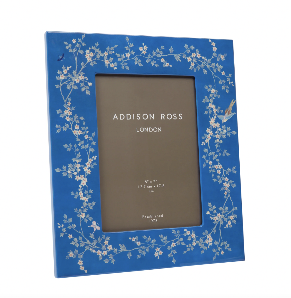 This 5" x 7" Chinoiserie blossom photo frame was exclusively designed by Sarah & David Ross, finished with 20 coats of high-gloss lacquer, hand-polished between each coat. This Blue frame is able to stand both landscape and portrait and features a black velvet backstand.
