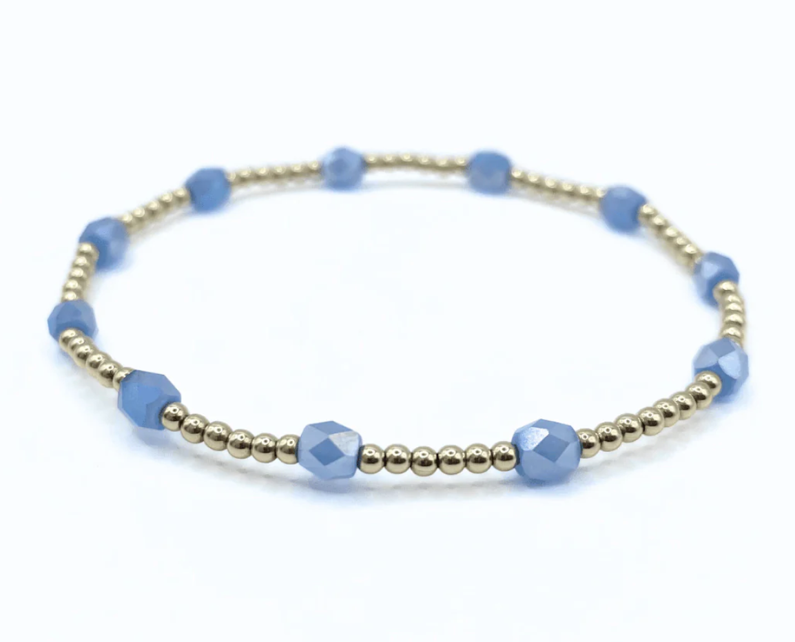 Vibrant yet soothing...like the waters of Key West. This beautiful bracelet features gold filled beads with soothing blue colored glass beads. Made for stacking, why pick just one color? 14k gold-filled with glass cut beads.