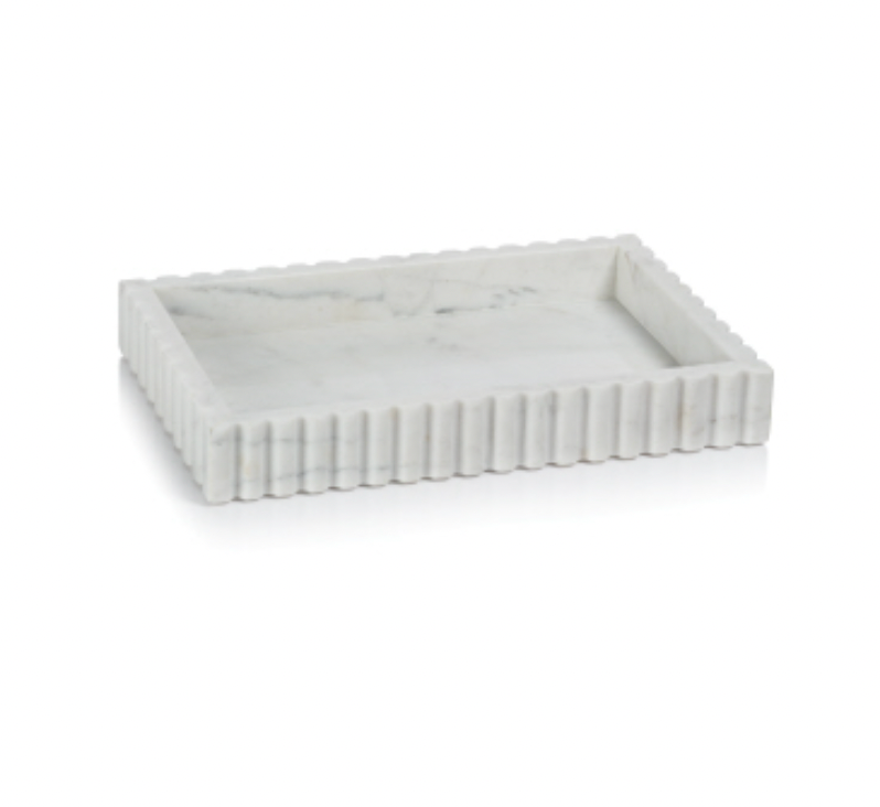 Beautiful white marble tray with scalloped details. Fabulous for a bath, the kitchen or coffee table. Two sizes available.