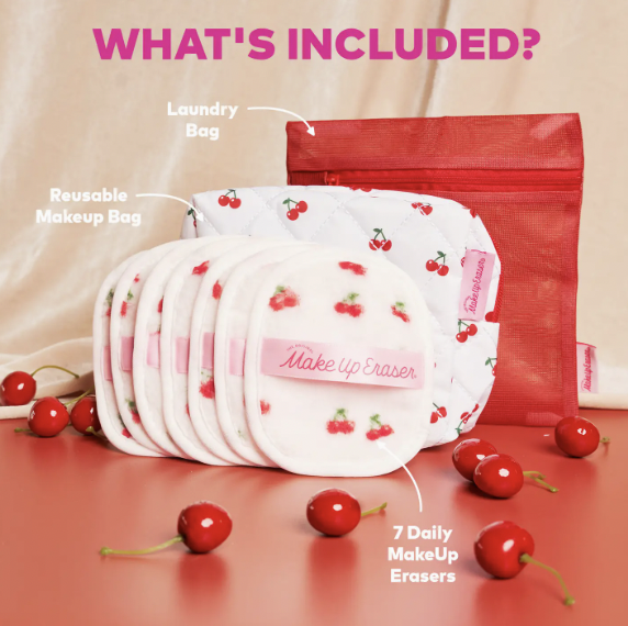 This gift set includes: 7 daily cloths, 5in x 4in. travel bag + laundry bag The Original MakeUp Eraser® removes makeup 2.5X better than the leading makeup wipe is non-irritating & non-drying, making it perfect for sensitive skin. It's safe for eyelash extensions & oil-free, perfecting your sustainable beauty routine.