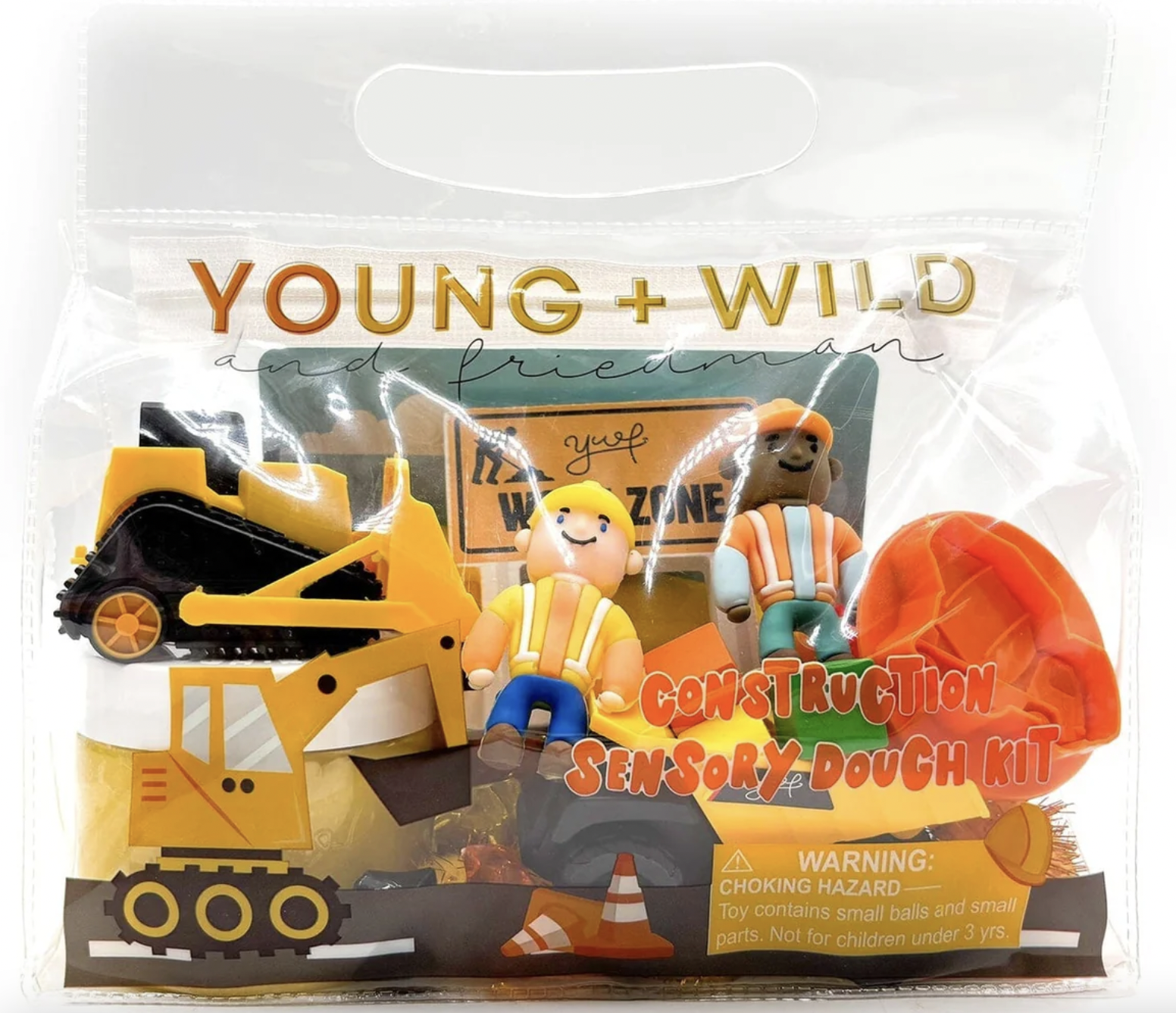 The Construction Sensory Dough Bag contains one jar of amazing all-natural sensory dough and everything you need to make the cutest construction scene - including construction figures, a rolling pin, a stamper, trucks, and more!
