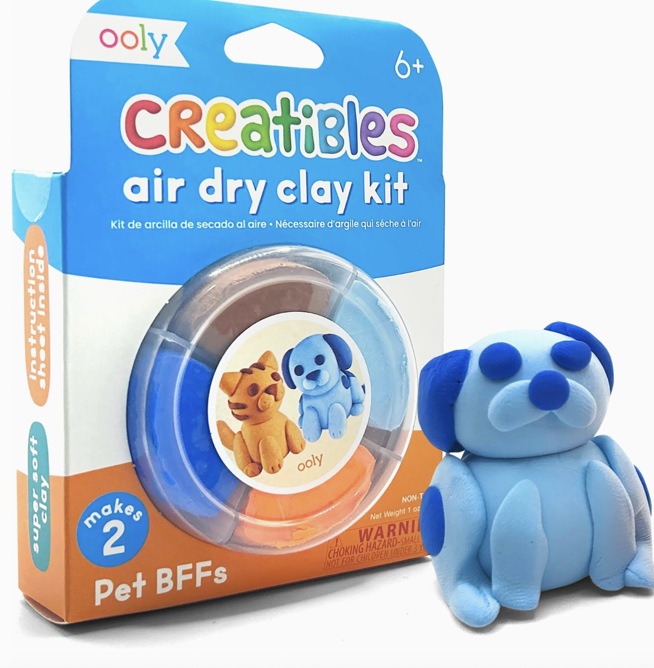 Give your little one the chance to make their very own sculptures with this easy to use air dry clay. The clay kit includes instructions for making two furry friends—an orange kitten and a blue dog, or whatever they want to create. The set’s reusable tub encases four colors of super soft, non-toxic clay, so your child has everything they need to create two adorably pawfect creatures. Air-dry clay kit 4 super soft pliable clay colors - mixable for endless possibilities Includes instruction sheet to make 2 BFF pet characters Resealable tub - keep lids tightly sealed! Non-toxic. Suitable for ages 6 and up.