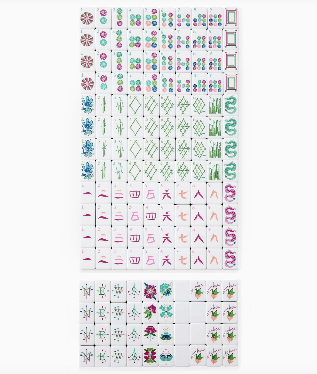 Set includes Tiles, Dice/Coin Bag and 4 Instructional Cards (If playing American Mahjong, will need to purchase NMJL Playing Card separately).