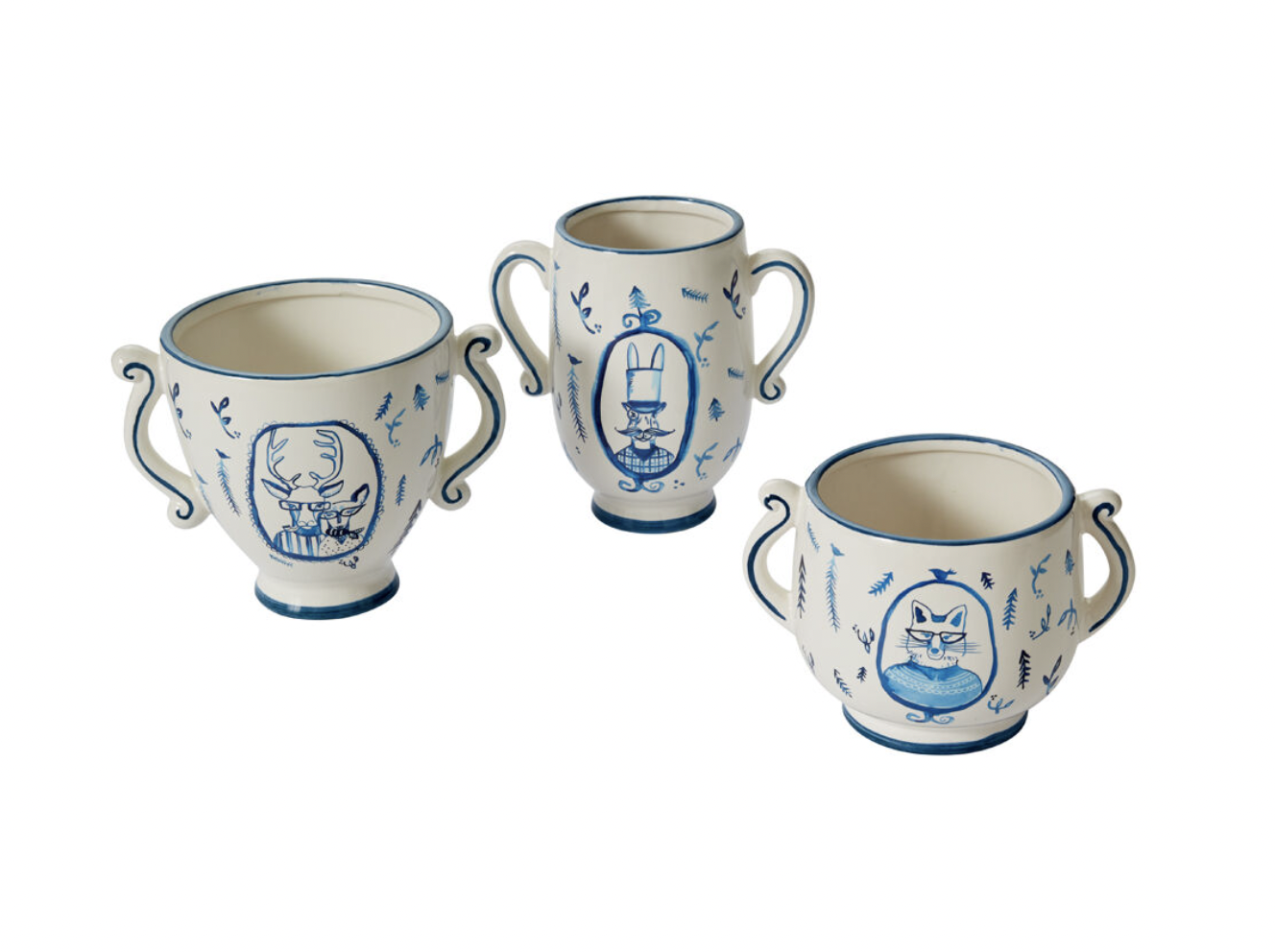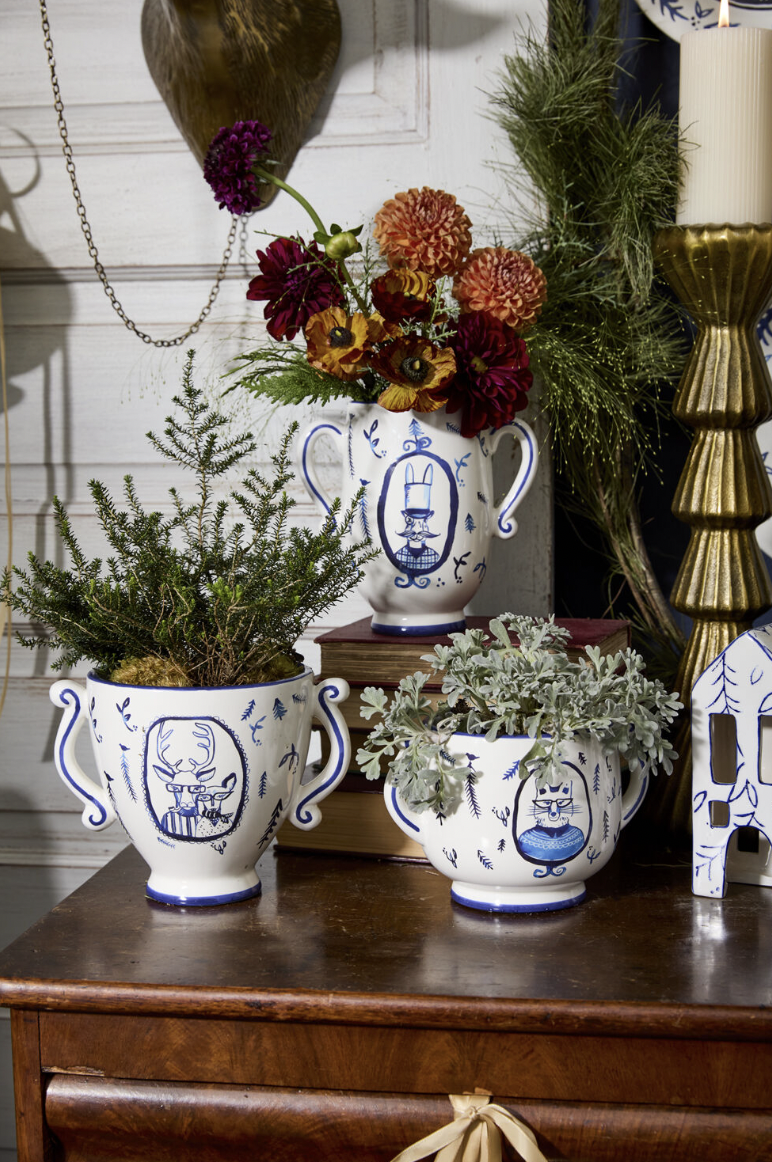 Liven up any holiday table with the E+E Portrait Pot Collection. Available in three sizes, each pot showcases a blue artwork decal of our favorite E+E characters—Eloise the fox, Eric the rabbit, and Frank & Margie the deer duo. They would even make a great utensil holder in a kitchen, or used as a planter for everyday!