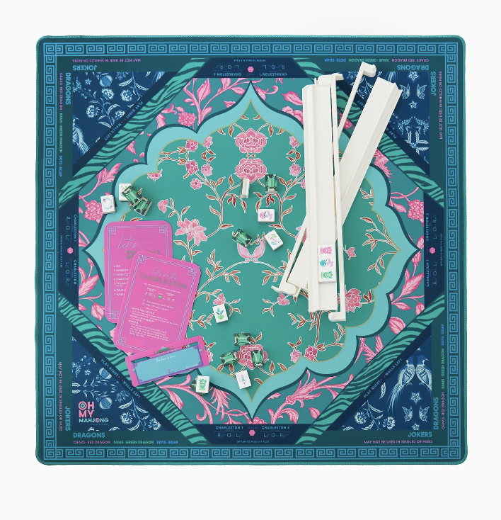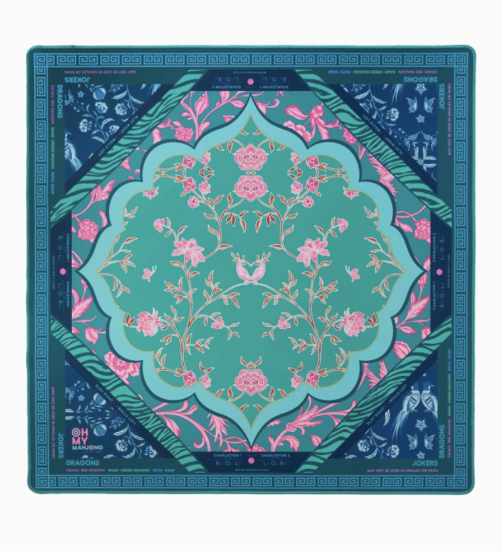Introducing the Esme Mat — a vibrant, artfully chic addition to your Mahjong setup, designed for those with a love for playful elegance and globally inspired design. Drenched in fresh tones of green, blue, and pink, this mat brings together painterly florals, bold zebra accents, and a classic cane border for a look that’s both spirited and sophisticated. It’s cosmopolitan yet inviting — the perfect marriage of Palm Beach whimsy and timeless heritage charm.