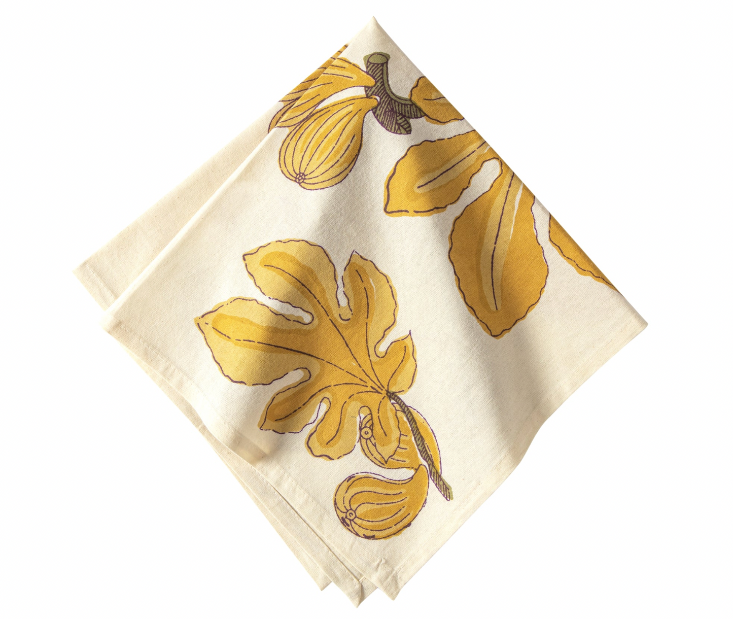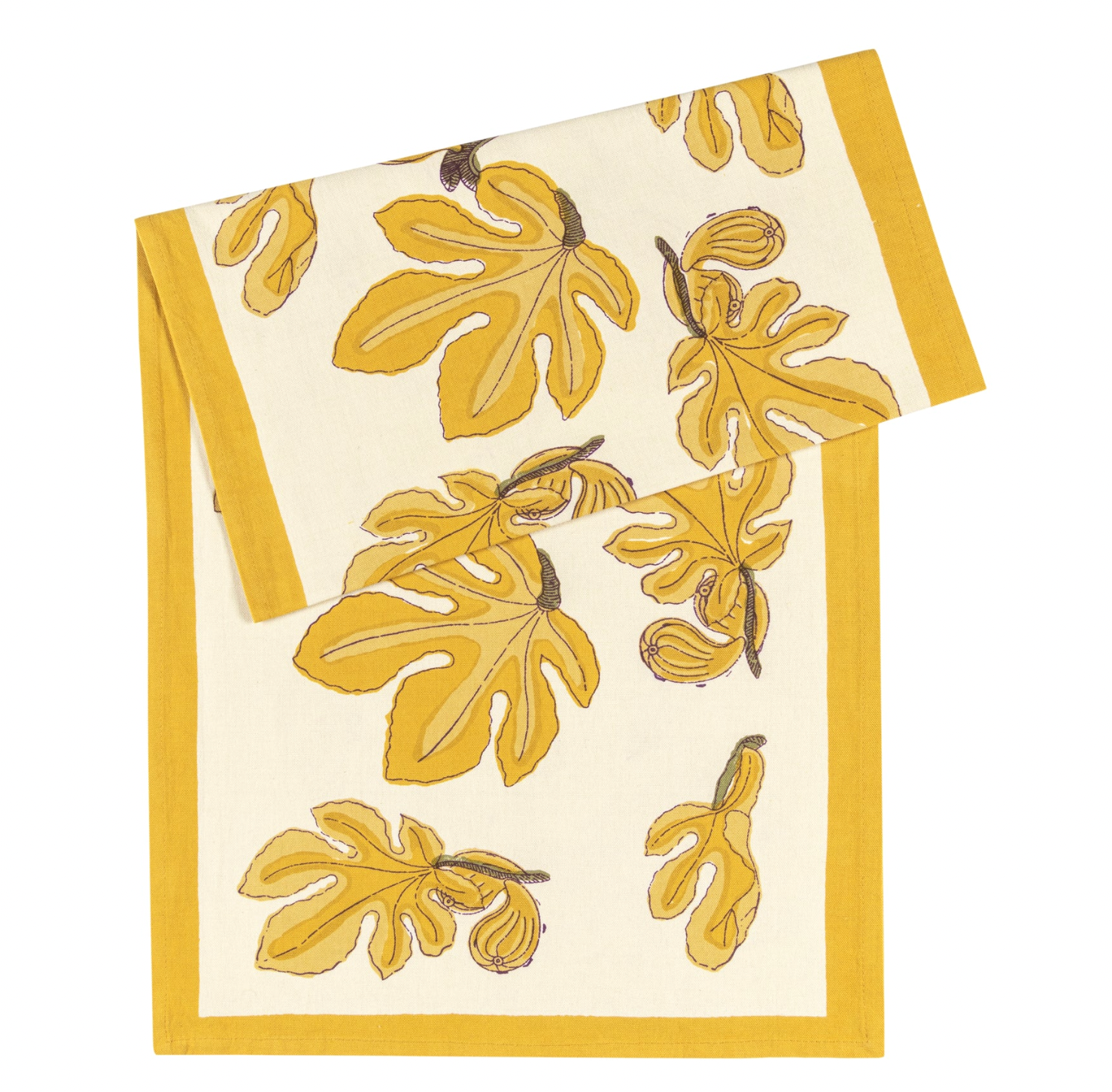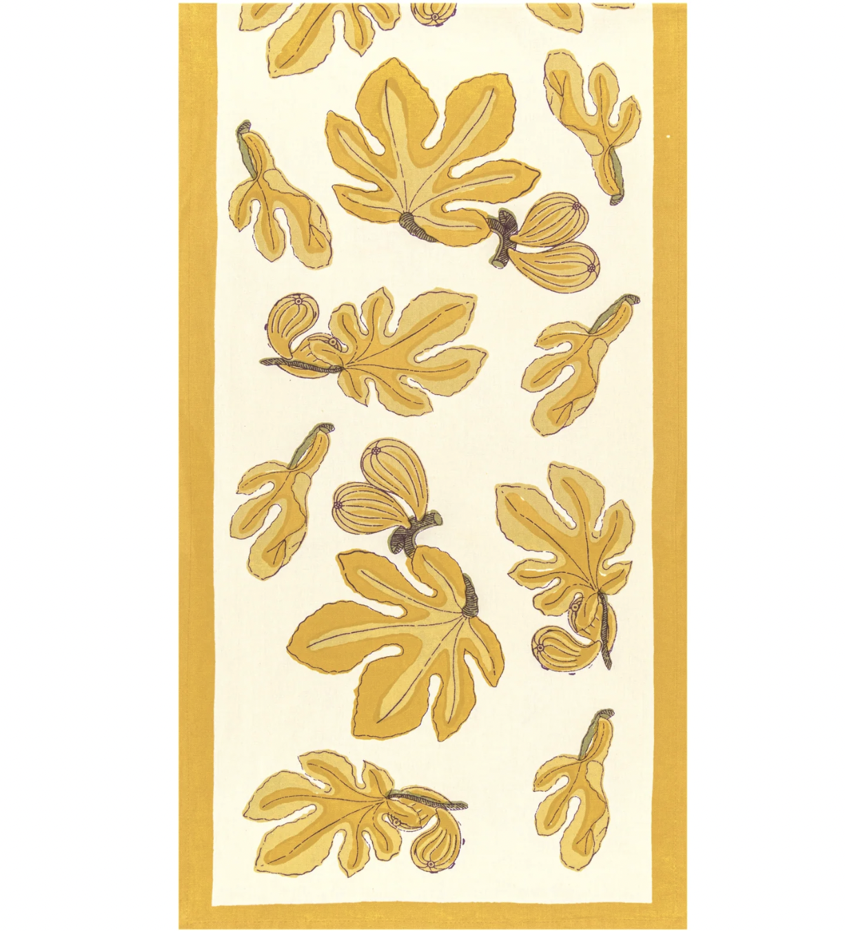 With rich, invigorating colors, this pattern showcases citrine figs and leaves against an ivory backdrop. This Fig Citrine Collection makes an excellent table setting, whether for special occasions or everyday entertaining. This French linen — available in a runner and napkins — has been carefully handprinted by skilled artisans using a time-honored technique, resulting in a singular piece of craftsmanship. Looks amazing layered with our Meadows Bleu or Pumpkins tablecloths.