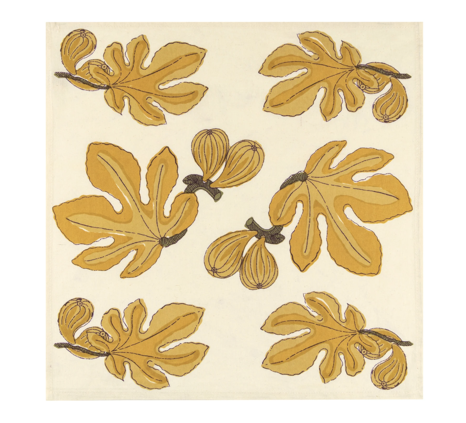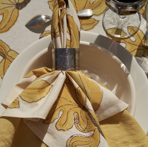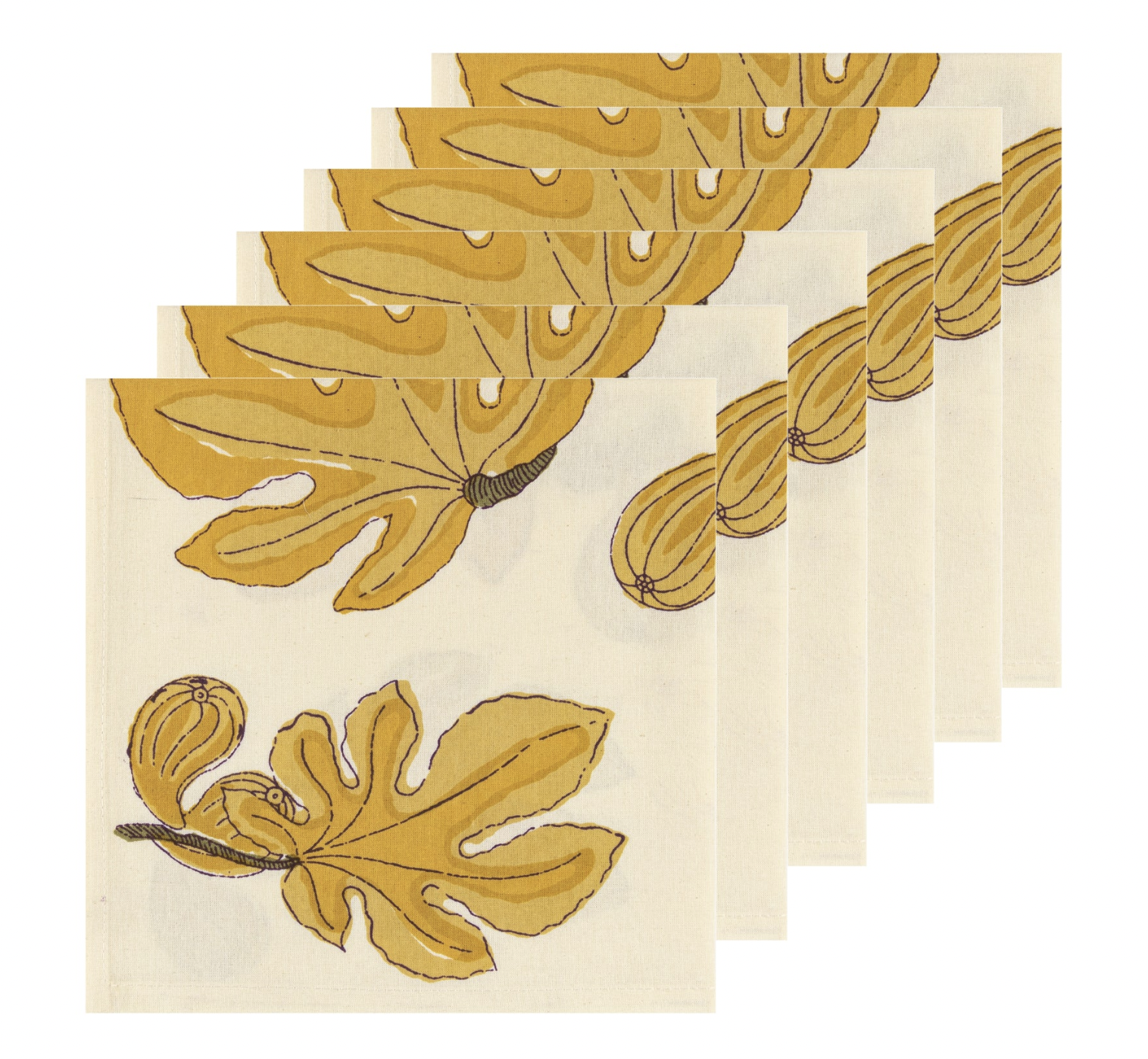 With rich, invigorating colors, this pattern showcases citrine figs and leaves against an ivory backdrop. This Fig Citrine Collection makes an excellent table setting, whether for special occasions or everyday entertaining. This French linen — available in a runner and napkins — has been carefully handprinted by skilled artisans using a time-honored technique, resulting in a singular piece of craftsmanship. Looks amazing layered with our Meadows Bleu or Pumpkins tablecloths.