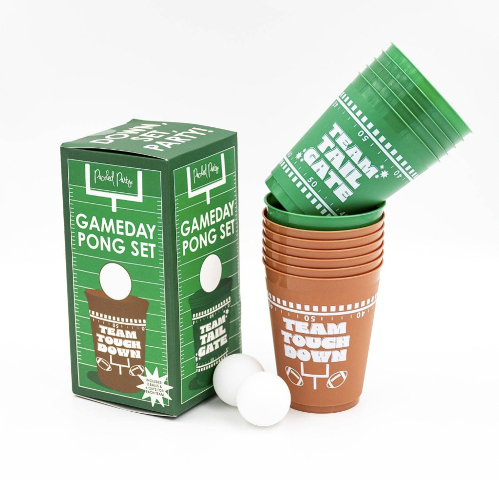 Make game days more fun with this Game Day Party Pong Set! Featuring six 16 oz reusable green "team tailgate" cups and six 16 oz brown "team touchdown" cups plus two pong balls, this is the perfect addition to any tailgate or game day party this season. Now which team will you pick for this ultimate game day pong match up?