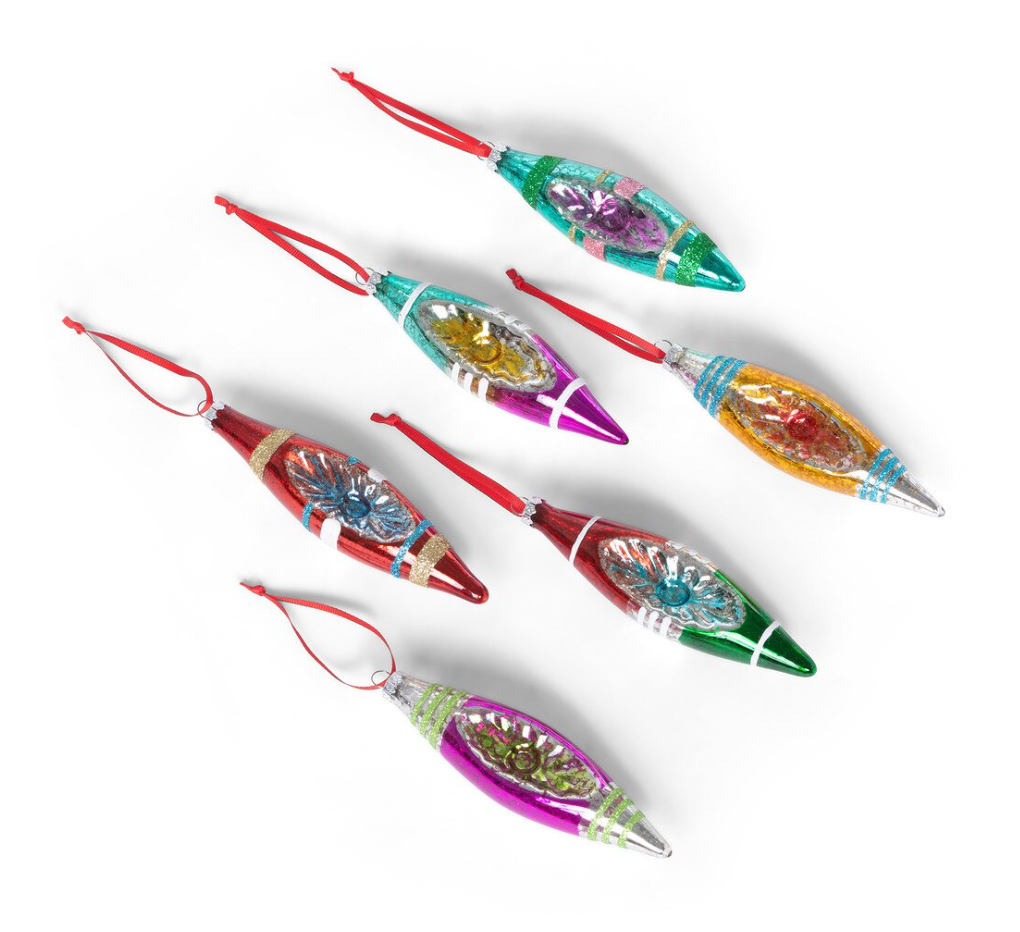 Add playful color to the holidays with a Reflector Glass Finial Ornament. This reimagined vintage decoration will stand out on the tree in the hues of pink, turquoise, and gold. The assortment of 6 brightly painted baubles is packaged for retail.