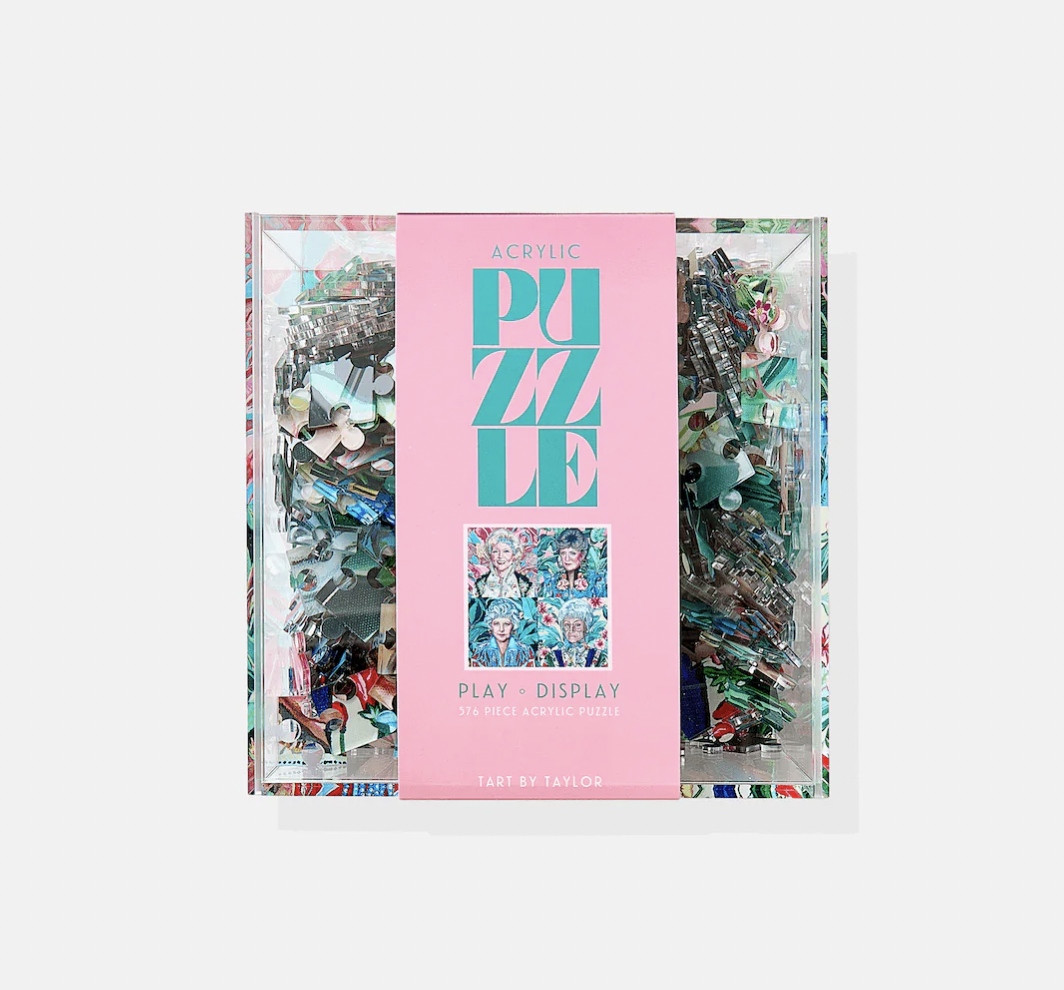 Piece together your love for the iconic "gals" with this fun Golden Gals Acrylic Puzzle. Made from durable acrylic material, this puzzle features the beloved best friends. With its bold design and matching acrylic display box, this puzzle is both playful and stylish. Show off your puzzle-solving skills with a display that's as unique as you are. Play + display with this stunner!