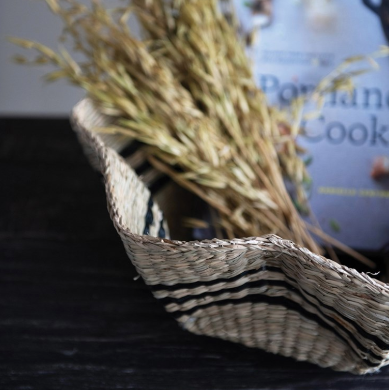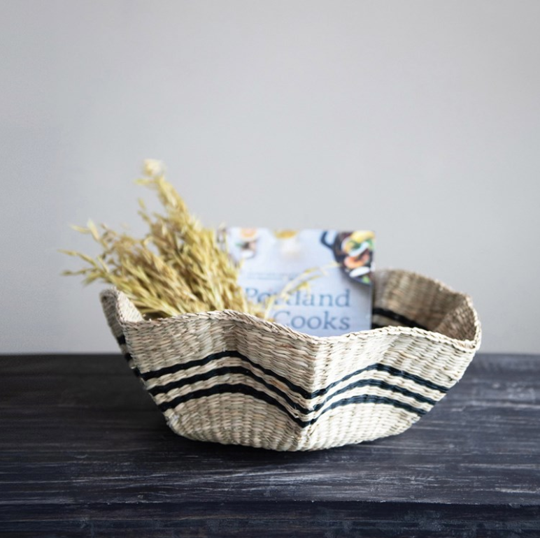 Hand-Woven Scalloped Sea Grass Basket with Black Stripes