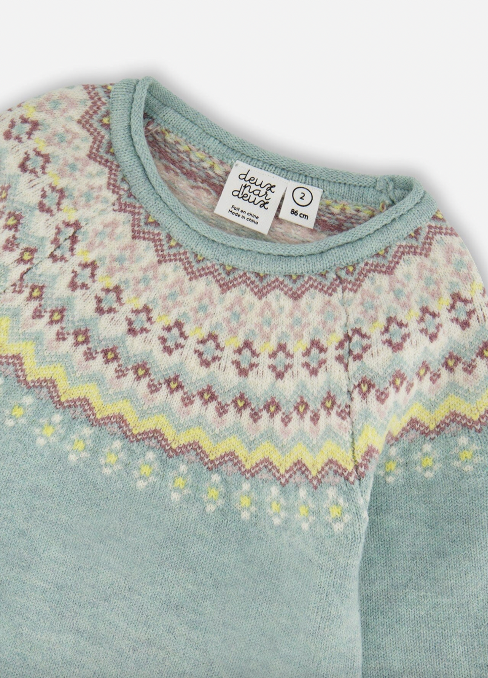 Deux par Deux's Jacquard Sweater Dress With Ribbed Skirt in Jade Green is a cozy statement piece with playful flair. This girly sweater dress features an intricate jacquard floral yoke, tiny flower motifs at the cuffs and hem, and a wide pleated skirt in ribbed knit for extra movement. Made from a soft stretch knit, it’s perfect for chilly days with leggings or tights.