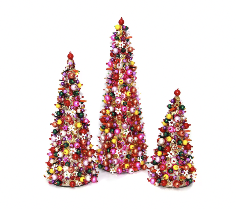Vintage inspired trees with beads, sequins, and pins. A fun addition to your holiday decor!