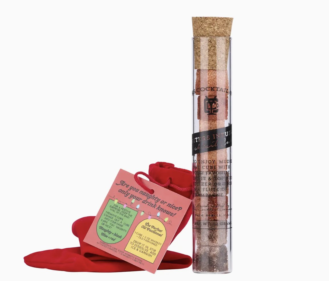 These Naughty or Nice Old Fashioned Sugar Cubes deliver holiday cheer without sacrificing quality: small-batch craftsmanship, elegant design, and a clever surprise inside every bag. Each artisan cane-sugar cube is infused with our house-made aromatic bitters and natural citrus oils to create a perfectly balanced instant Old Fashioned, but half the cubes hide a spirited twist. Will your drink be nice (a holiday red hue) or naughty (Charcoal-black)? The only way to find out is to shake a cube from the bag!