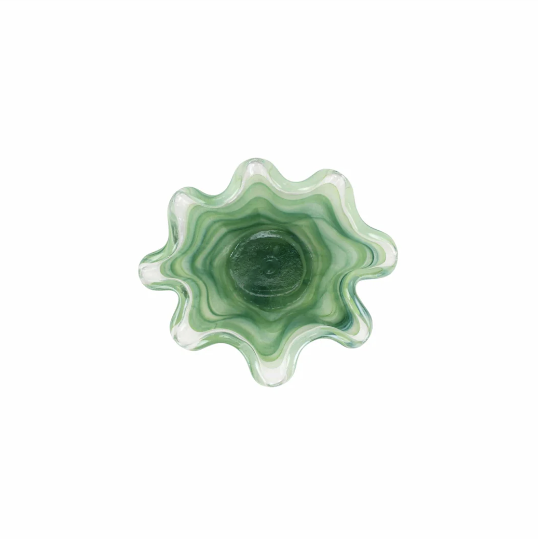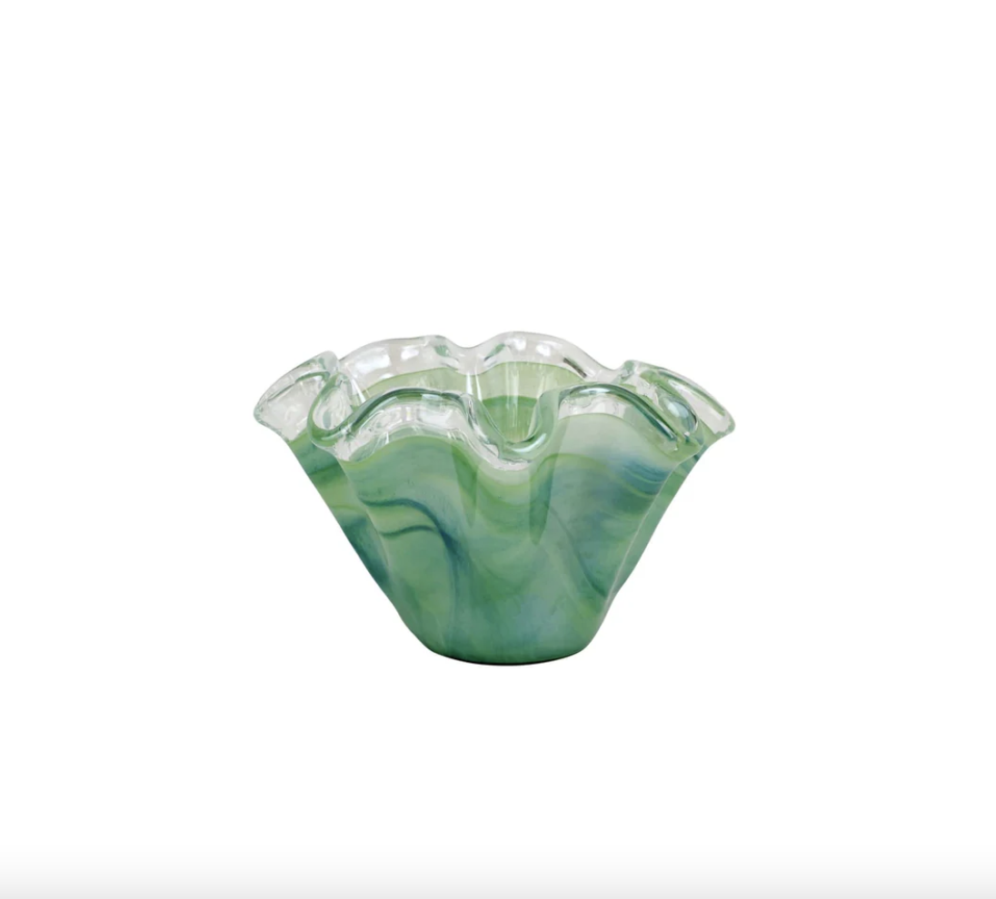 Mouthblown in Italy, the Onda Glass Petite Ruffled Round Bowl makes a sophisticated statement on its own or as part of a larger Onda collection.