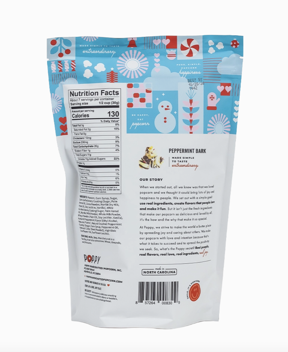 Lightly flavored peppermint popcorn layered with dark and white chocolatey drizzle, then sprinkled with all-natural crushed peppermint candies for the ultimate holiday treat. Each market bag contains 5 cups of popcorn and features an embedded zip lock. Shelf life is 6 months unopened.