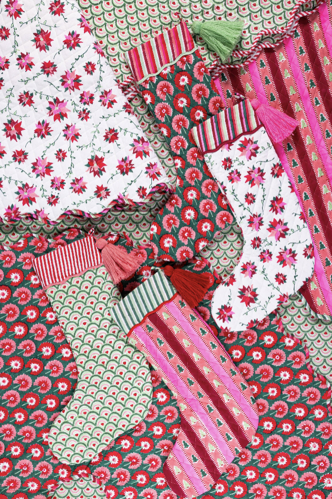 Add some festive flair to your mantel this season with this exclusive blockprint stocking. Handmade in India and decked out with chic trim, tassels, and pom poms, these one-of-a-kind pieces add a luxe layer to your holiday decor. Hand block printing in India is a traditional craft that involves carving intricate designs onto wooden blocks and using them to create beautiful patterns on the textiles. The artisans receive a fair price for their work and are treated with respect, while also promoting sustainable and ethical production methods. With a focus on our planet and sustainability, our cotton is sourced under the guidelines of the Better Cotton Initiative whose farming practices better our farmers, their communities, and the environment.